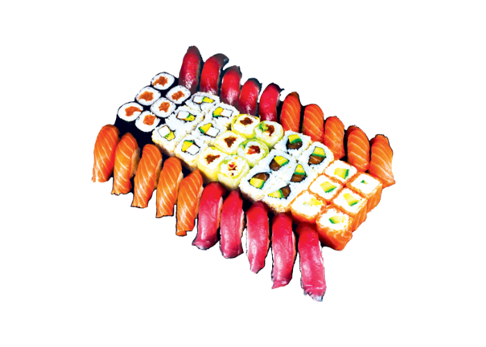 10 Sushi saumon + 10 Sushi thon + 6 California saumon avocat + 6 California chair de crabe avocat + 6 Maki pink avocat cheese + 6 Maki light chèvre cheese tomate sechée basilic + 6 Maki saumon + 4 Soupes + 4 Salades + 1 Coca cola 1.25l.